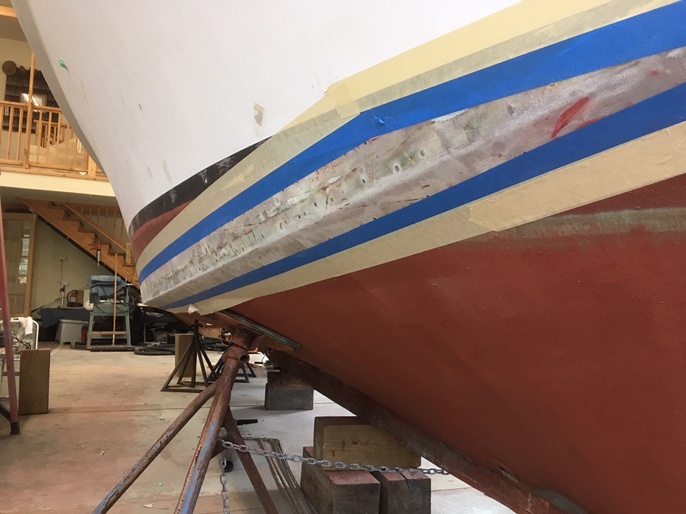 Remove old chine rails, install new forward spray rails, repair and re-glass chines