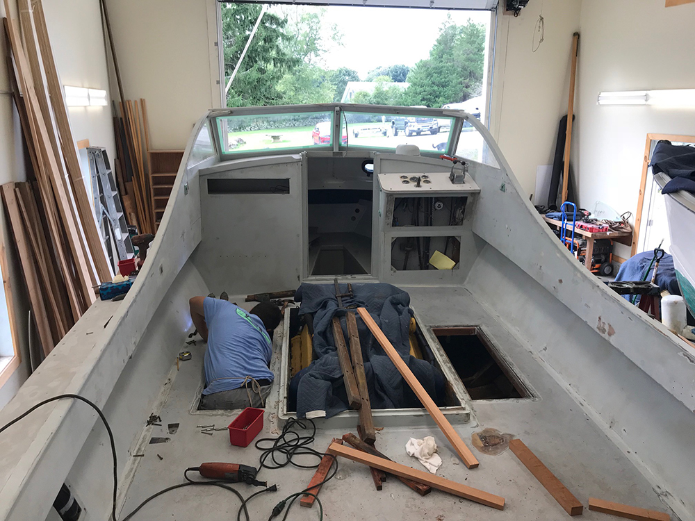 Remove unwanted hardware, radar mast, old electronics, and ancient bimini and frame; old seating and all cushions